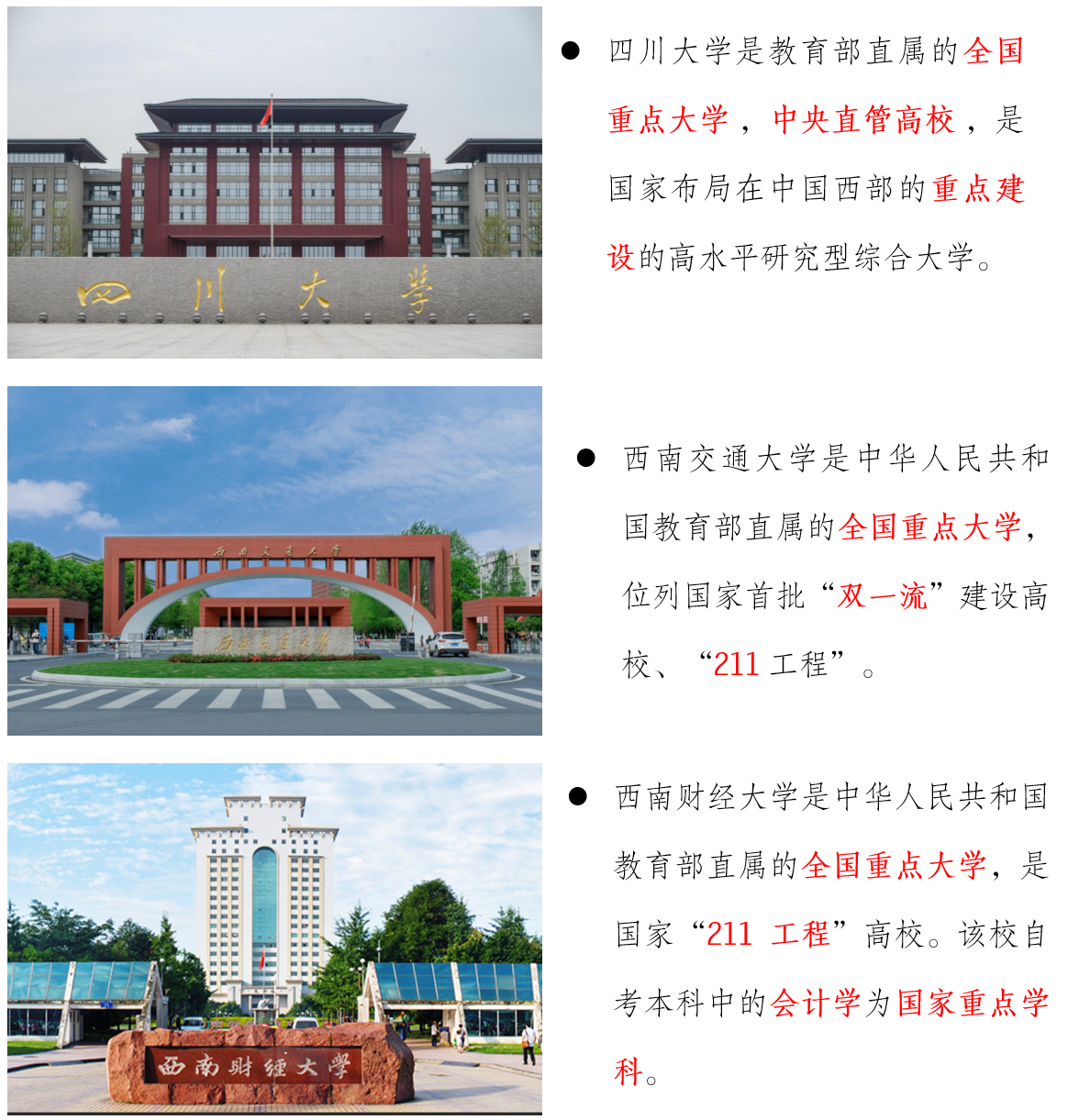 我院是西南交通大学、西南石油大学、西南财经大学、成都信息工程大学、四川旅游学院等高校的应用型自学考试助学点,携手川大、西南交大、西南财大等知名高校共同开展应用型自考本科“双证”项目,实现学历与能力并重培养。同时,面向社会开展四川大学、四川农业大学、西南石油大学、西华师范大学、西华大学等院校的成人高考高起专、专升本学历教育,构建多元贯通的升学通道。