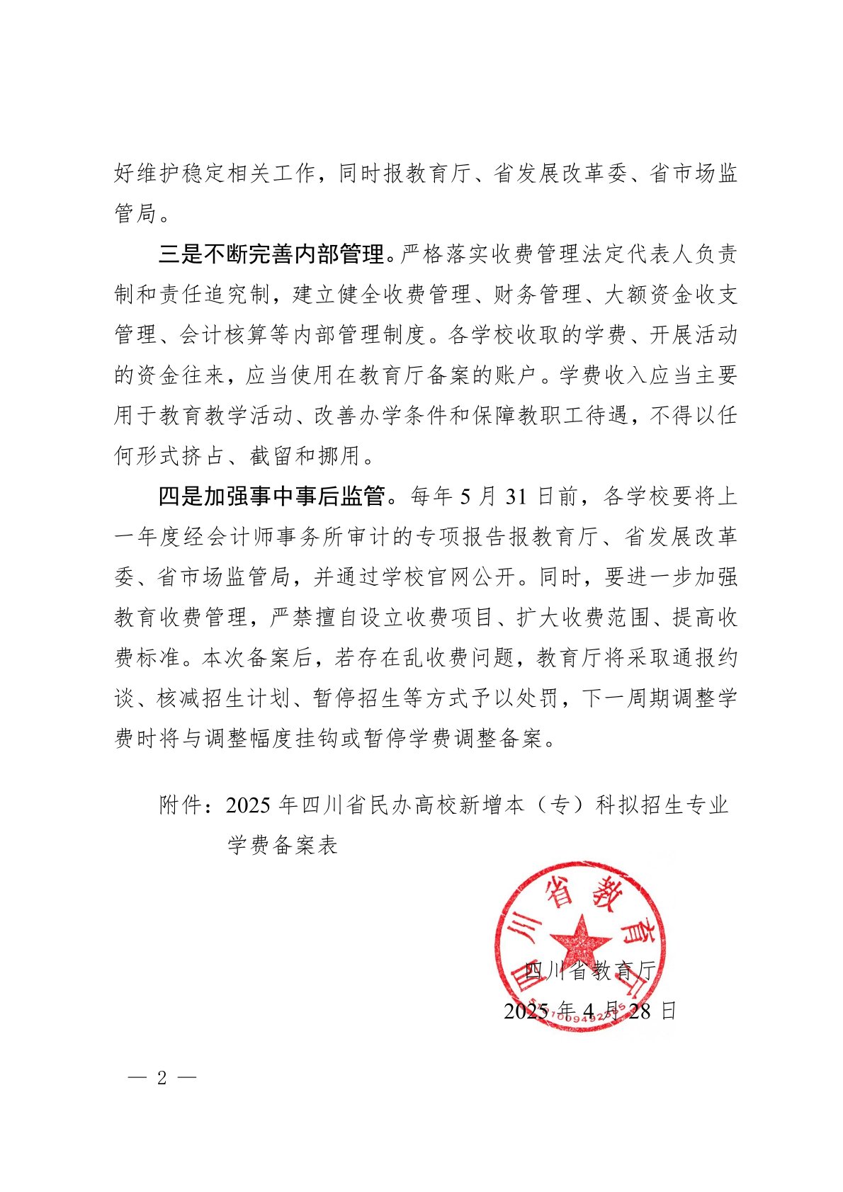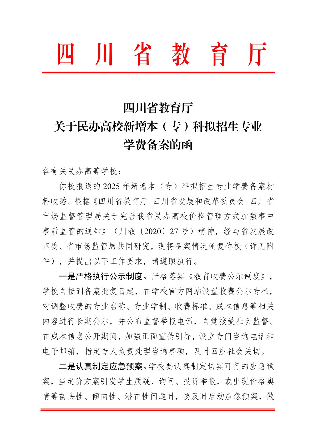 四川省教育厅关于民办高校2025年新增本(专)科拟招生专业学费备案的函